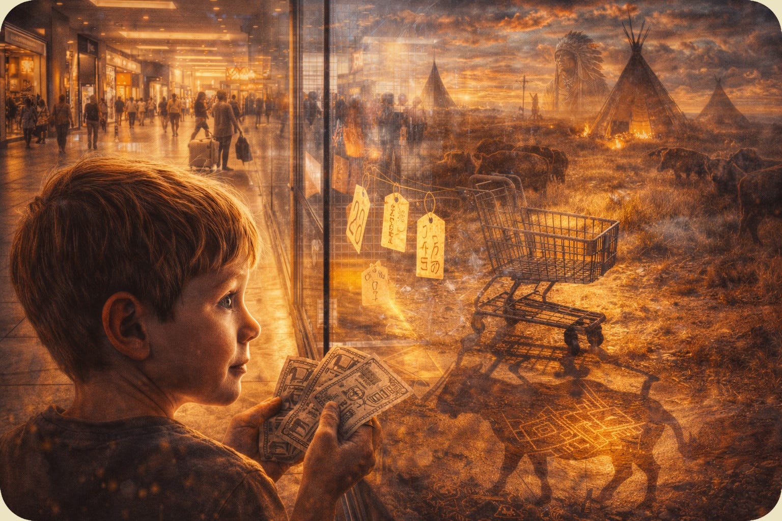 Verse 1 Opening day, the doors swing wide, Crowds pour in with hungry eyes. Through the glass I watch them push, Where cedar trees once touched the sky. (Where cedar trees once touched the sky…) Pre-Chorus They built it fast, they built it high, Never asked the reasons why. Chorus Dancing with ghosts on borrowed ground, Can you hear them? Can you hear that sound? Ancient voices in the walls, Whisper through these shopping malls. (Whisper through these shopping malls…) Verse 2 (Lakota prayer) Makoce ki lena wakan, Tunkasila, ceunniciyapi, Oyate ki najin pelo. (The land here is sacred, Grandfather, we pray to you, The people are standing.) Bridge Steel and stone where buffalo ran, Progress marches, stick to the plan. But in the night when stores are bare, Something stirs in empty air. (Something stirs in empty air…) Verse 3 Guards rotate, the night grows still, Shadows dance where shelves are filled. Price tags cover sacred soil, Children play on holy ground, Not knowing what was lost or found. Outro Dancing with ghosts… (We’re dancing with ghosts…) Dancing with ghosts… (On borrowed ground…)